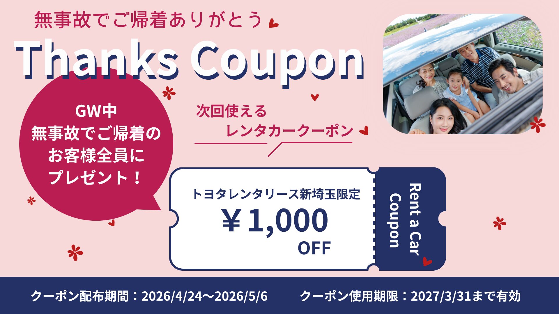次回使えるレンタカークーポン(1,000円OFF)をプレゼント!