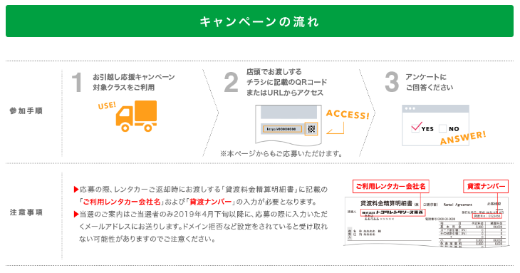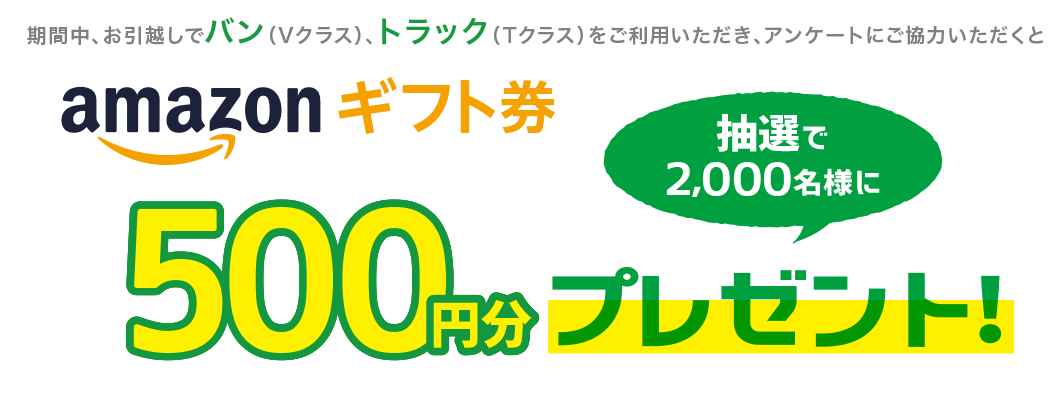 期間中、お引越しでトヨタレンタカーのバンまたはトラックをご利用の上、アンケートにご回答いただいたお客様へ、抽選で2,000名様に500円分のamazonギフト券プレゼント!