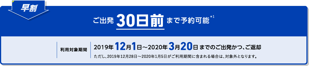 利用対象期間:2019年12月1日~2020年3月20日までのご出発かつ、ご返却