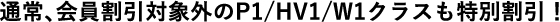 通常、会員割引対象外のP1/HV1/W1クラスを特別割引!今回も「P2/HV2/W2クラス」まで特別割引!