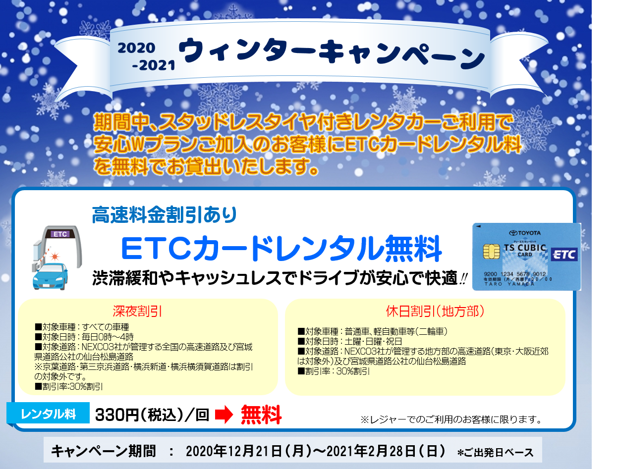 - ETCカードは数に限りがございます。予めご了承ください。ご予約の際は「ETCカード利用」とお伝えください。