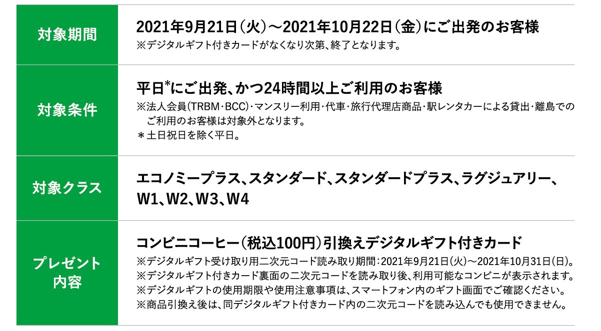 対象クラスを24時間以上レンタルすると、ご利用時間に応じてコンビニコーヒーデジタルギフト付きカードをプレゼント!!