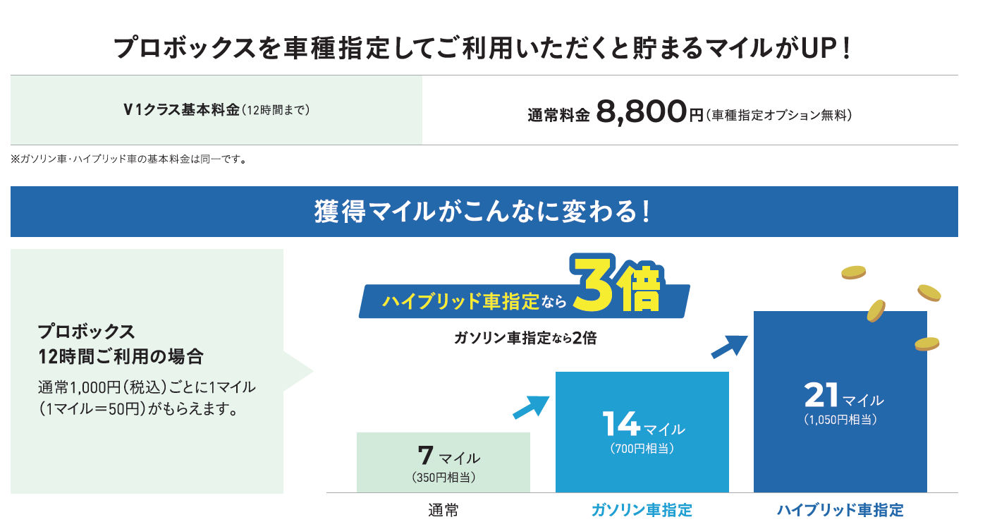 ※上記は、通常料金で12時間の基本料金ご利用の場合の獲得マイルです。(免責補償への加入および、その他オプション利用は含まれておりません。)