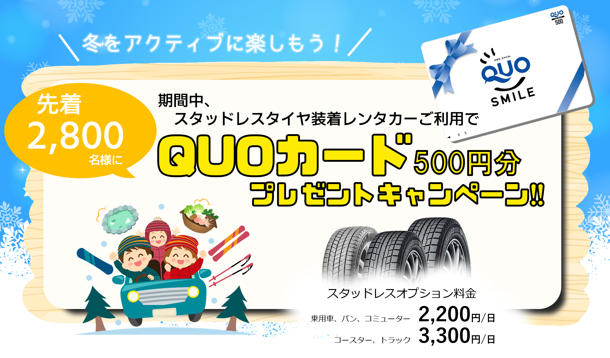 期間中、スタッドレスタイヤ装着レンタカーご利用で、先着2,800名様にQUOカード500円分をプレゼントいたします!
