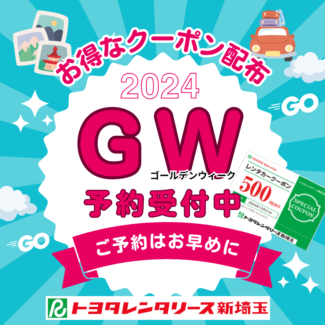 トヨタレンタリース新埼玉ではGW中、レンタカーご利用のお客様に、次回ご利用時に使えるレンタカークーポン券を配布いたします。