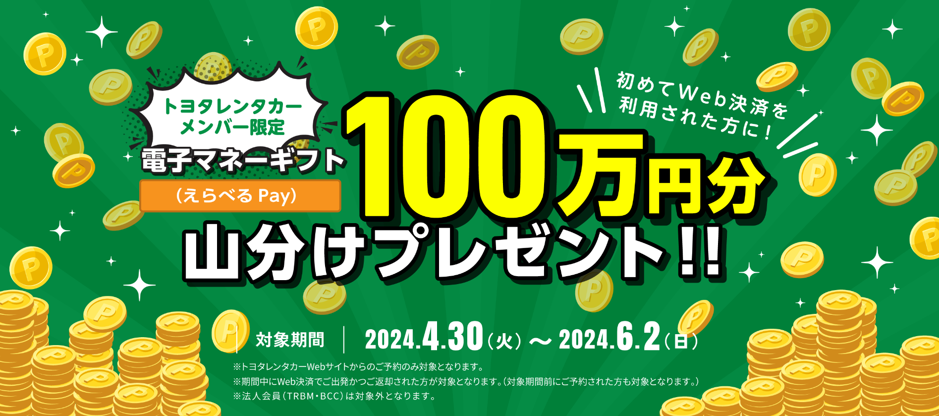 電子マネーギフト『えらべるPay』100万円分を山分けプレゼント※2023年4月30日以降初めてWeb決済をご利用されるトヨタレンタカーメンバー様限定