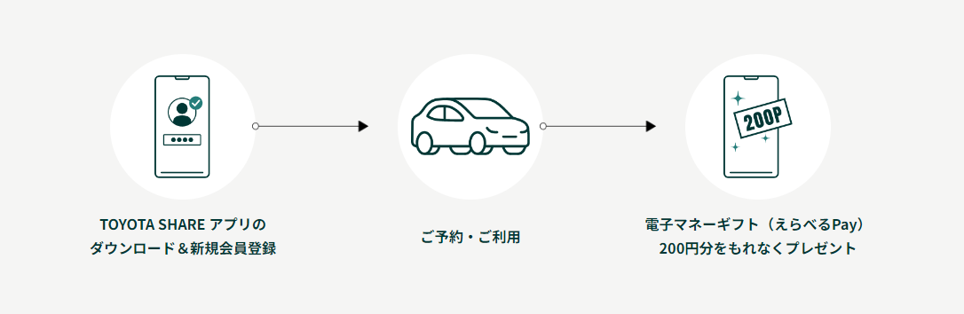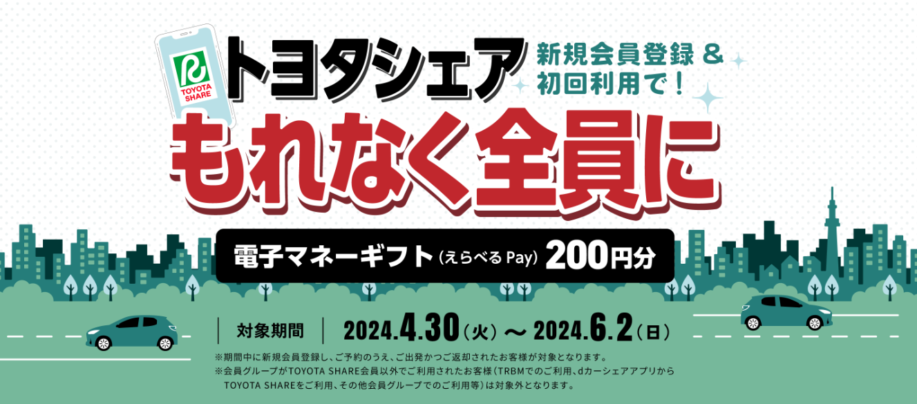 トヨタシェアの新規会員登録&初回利用で、電子マネーギフト『えらべるPay』200円分をもれなく全員プレゼント