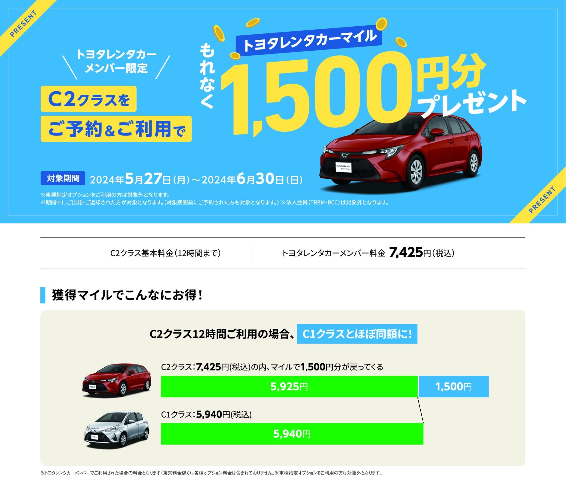 C2クラスをご予約・ご利用で、もれなくトヨタレンタカーマイル1,500円分プレゼント
