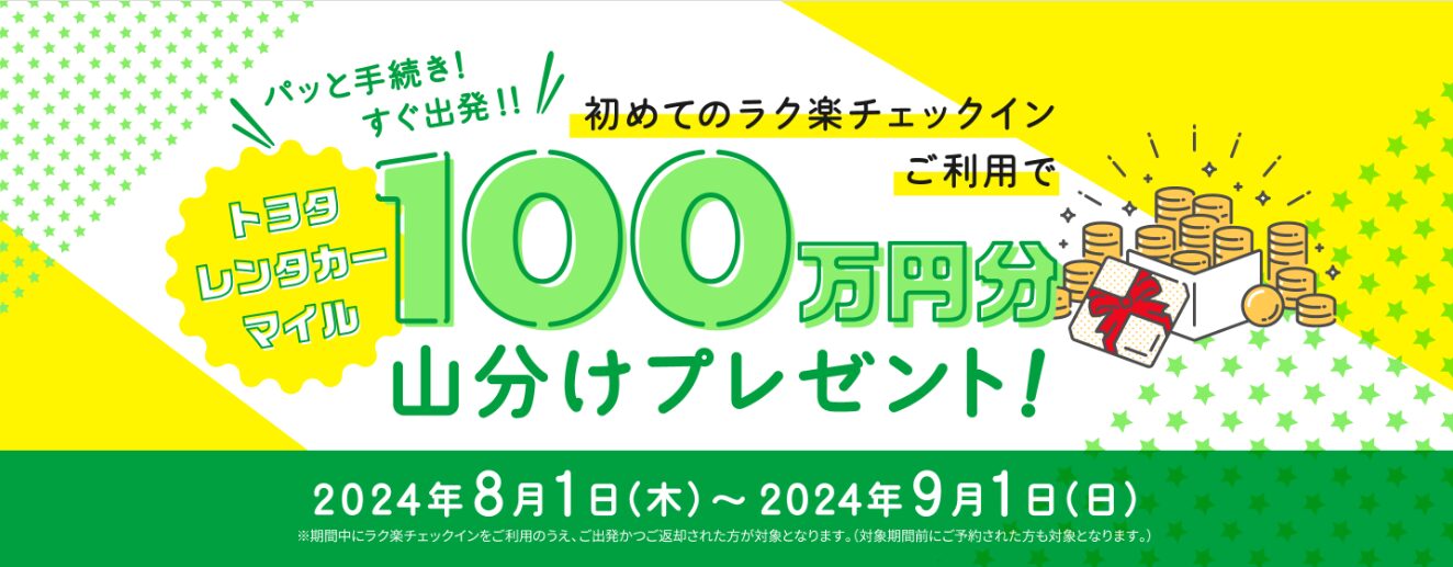 トヨタレンタカーマイル100万円分を山分けプレゼント※2023年8月1日以降初めてラク楽チェックインをご利用されるトヨタレンタカーメンバー様限定