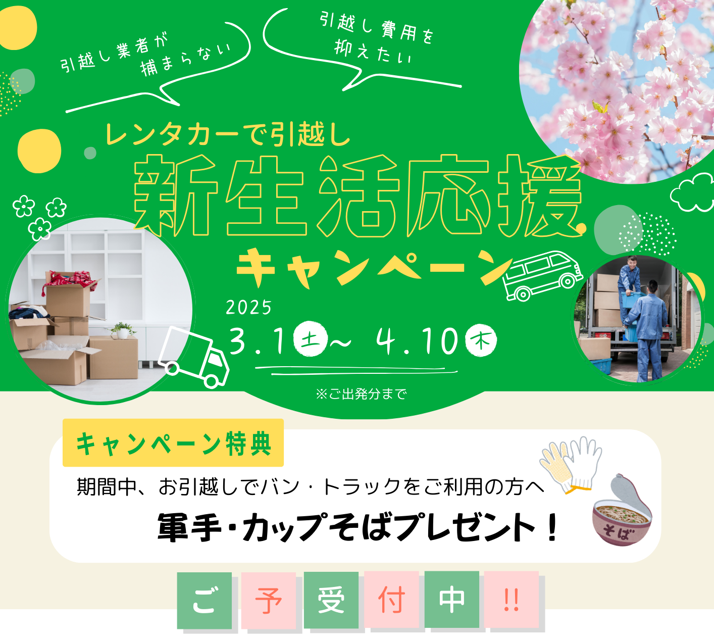 期間中、引越しでバン・トラックをご利用の方に軍手、カップそばをプレゼント!