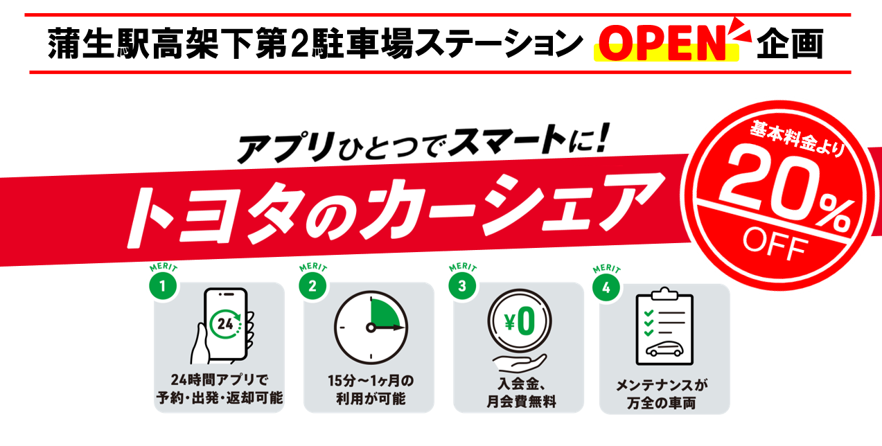 期間中、蒲生駅高架下第2駐車場ステーション限定でトヨタシェア基本料金より20%割引させていただきます