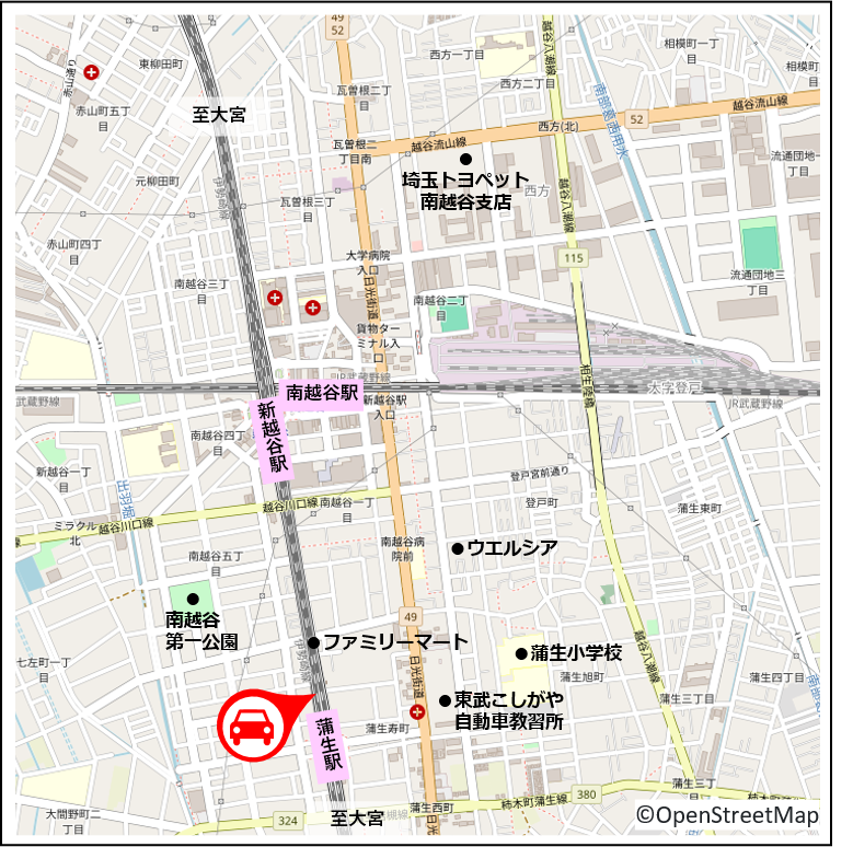東武鉄道伊勢崎線「蒲生駅」より越谷駅方面に徒歩3分 高架下駐車場内にステーションを設置いたしました。