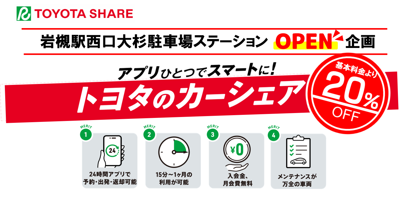 期間中、岩槻駅西口大杉駐車場ステーション限定でトヨタシェア基本料金より20%割引させていただきます