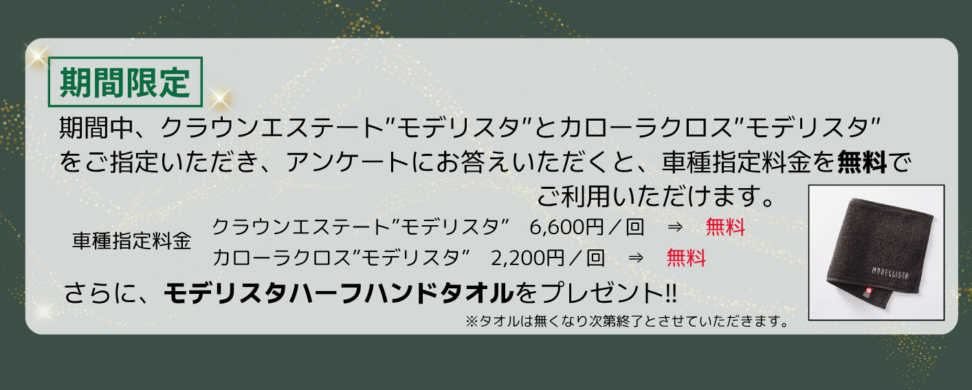 期間限定で、クラウンエステート”モデリスタ”、カローラクロス”モデリスタ”、ヤリスクロス”モデリスタ”をご指定いただき、アンケートにお答えいただくと、車種指定料金を無料で、ご利用いただけます。