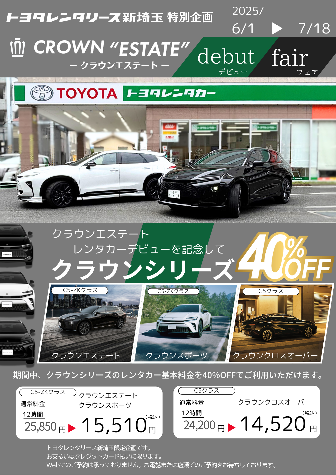 内 容:期間中、クラウンシリーズ(クラウンエステート、クラウンスポーツ、クラウンクロスオーバー)の基本料金40%OFFでご利用できます。