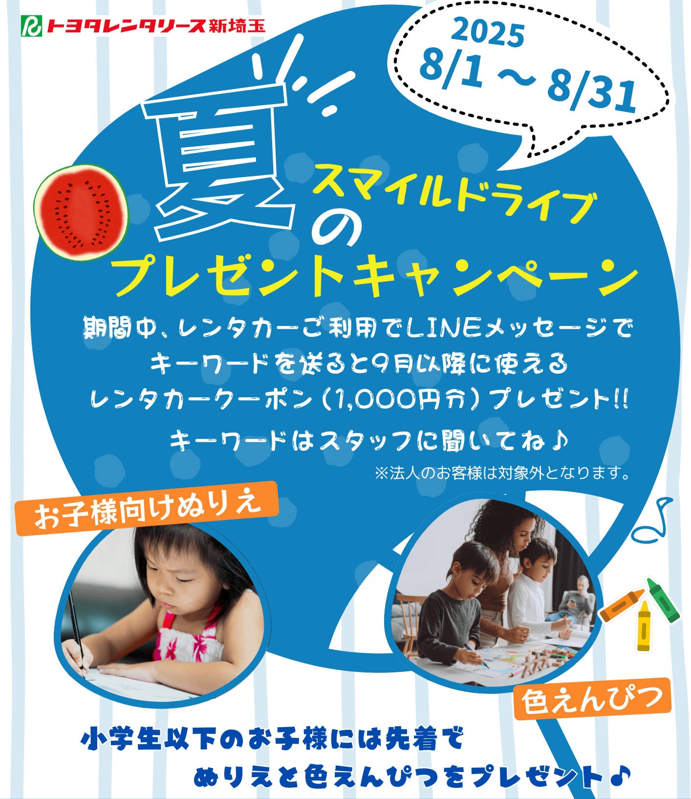 期間中、レンタカーご利用でLINEメッセージでキーワードを送ると9月以降に使えるレンタカークーポン(1,000円分)プレゼントいたします。
