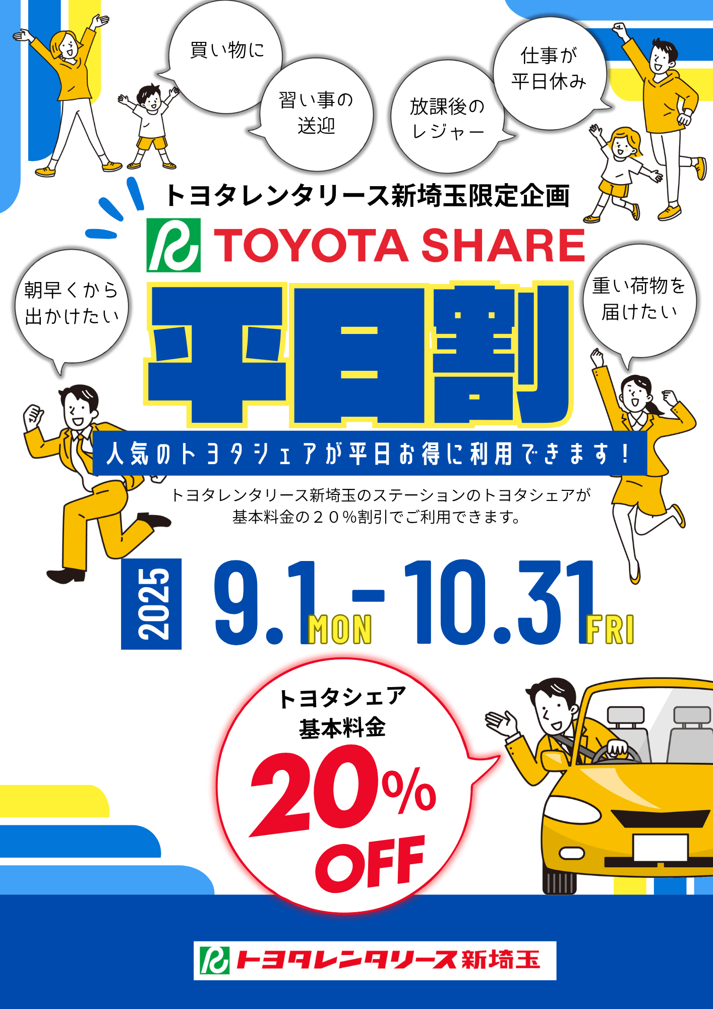 平日限定で、トヨタレンタリース新埼玉のステーションのトヨタシェアが基本料金から20%OFFでご利用できます。
