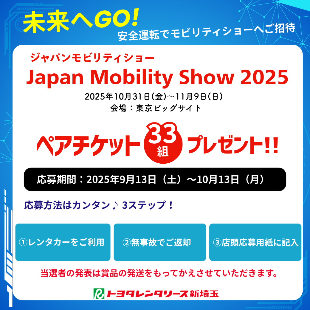 期間中、トヨタレンタカーをご利用いただき、無事故でご返却いただいたお客様の中から、 抽選で33組66名様に「ジャパンモビリティショー2025」のチケットをプレゼント!