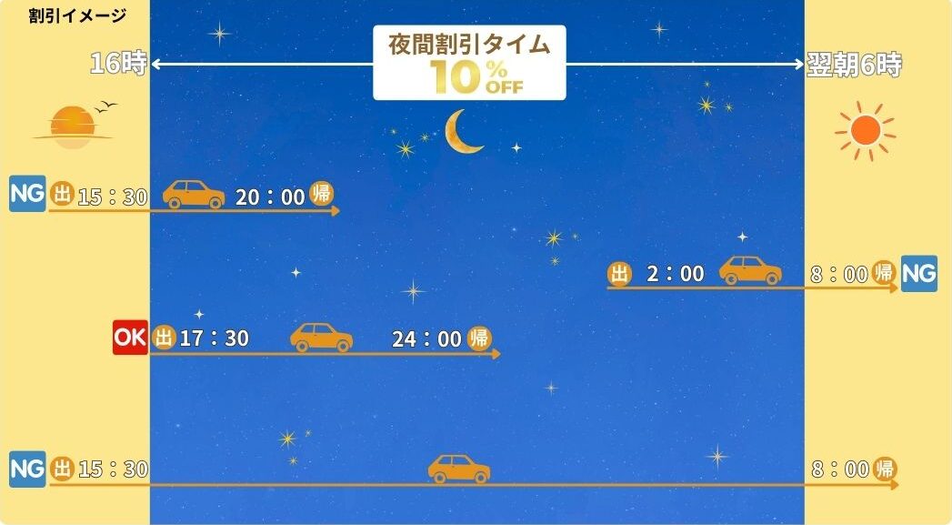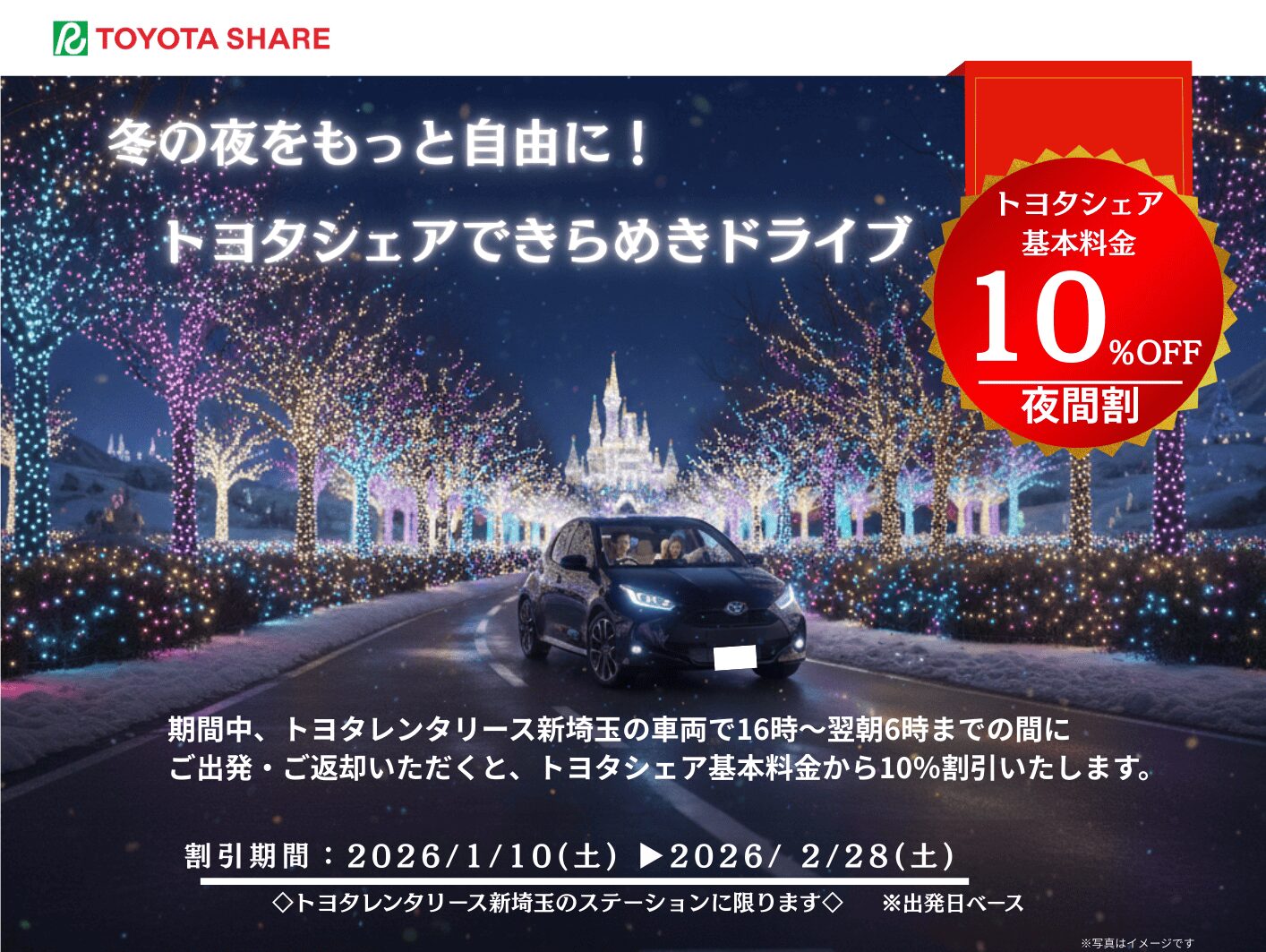 期間中、16時~翌朝6時の間にご出発・ご返却いただくと、トヨタシェア基本料金が10%OFF!