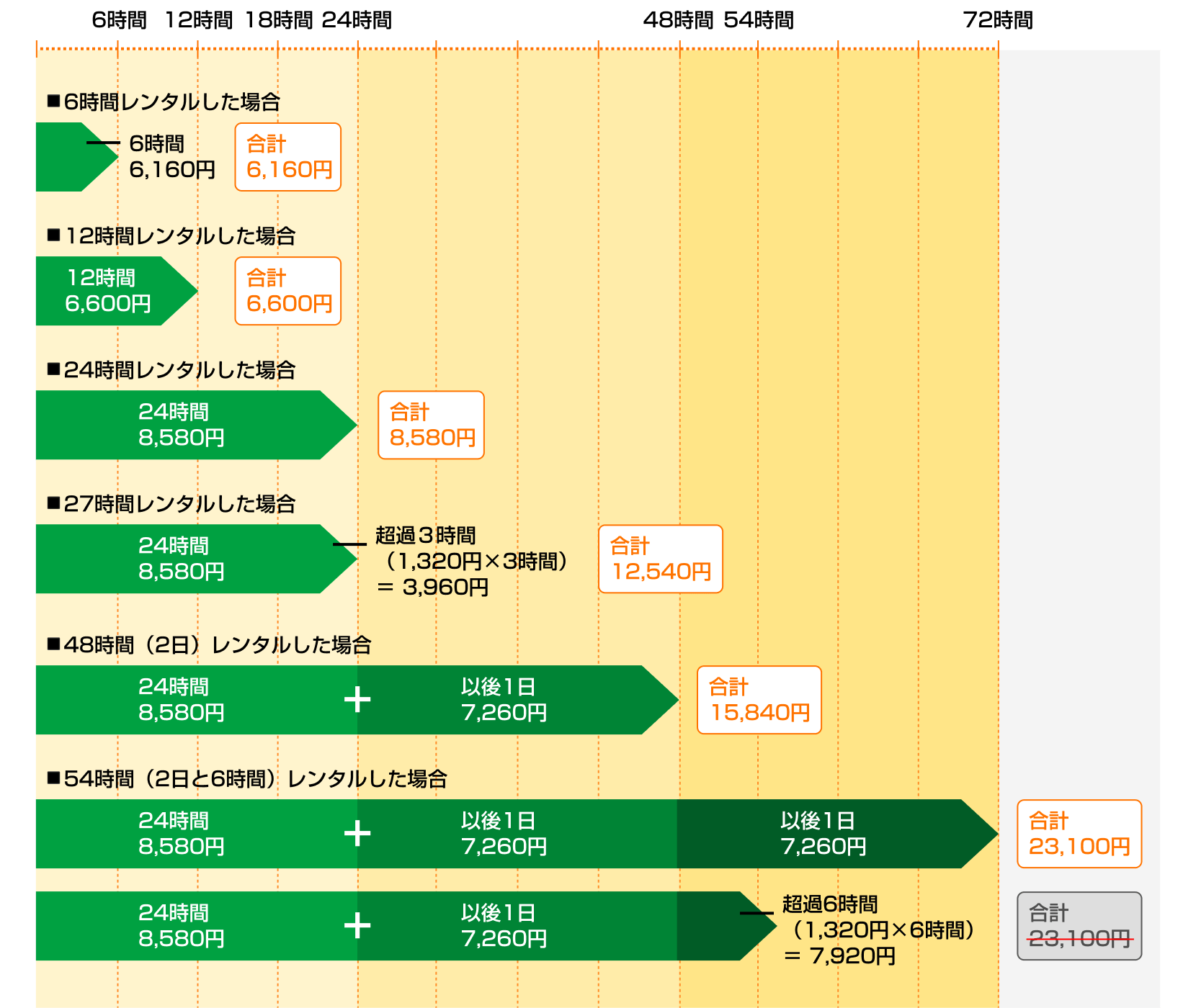 上記例の場合、超過が6時間以上であれば、同じ料金で72時間(3日)ご利用いただけます。