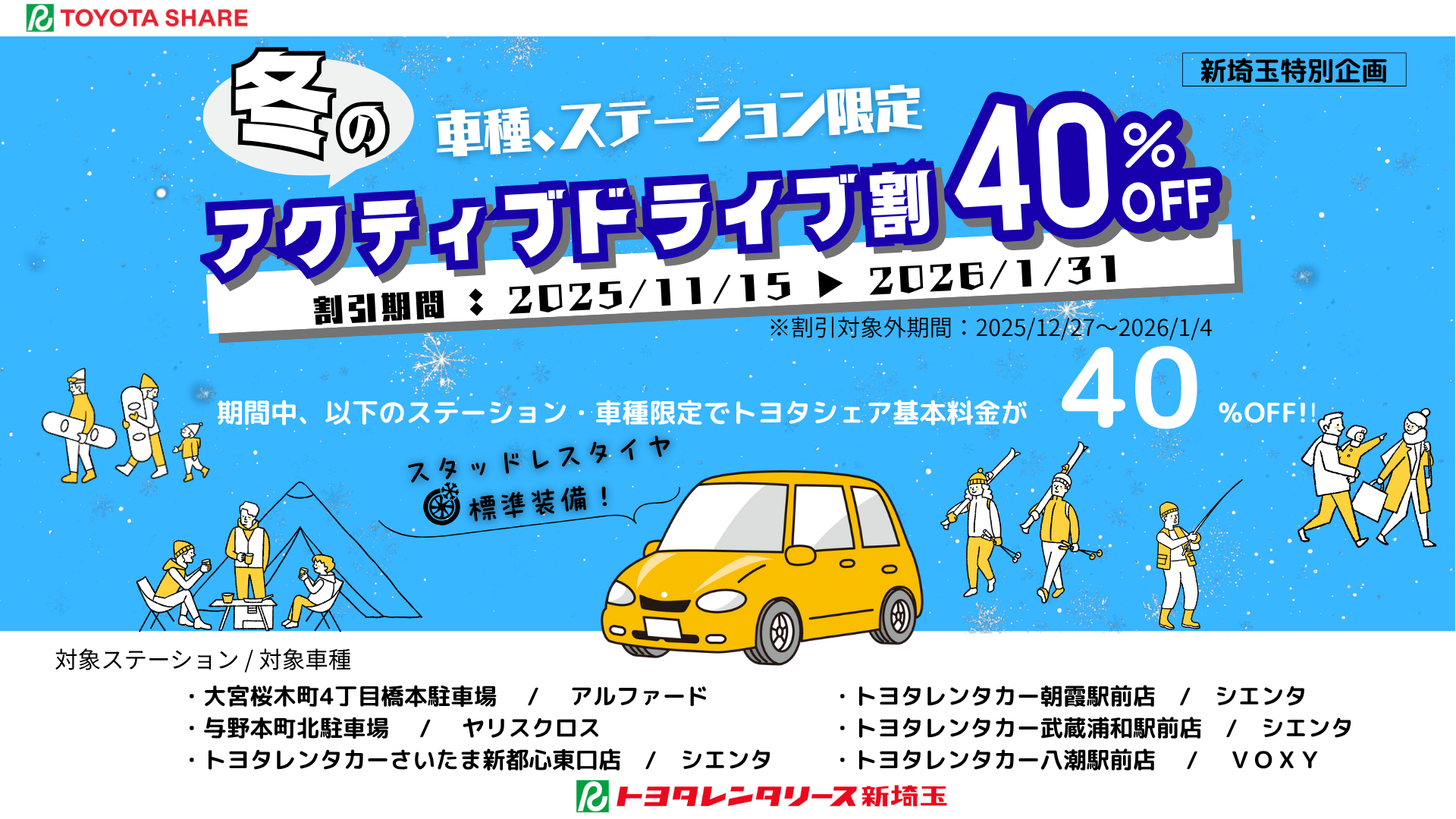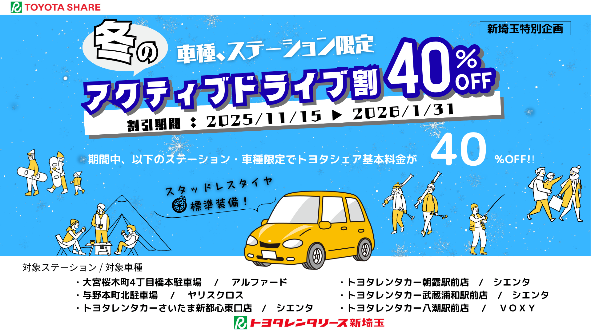 期間中、以下のステーション・車種限定でトヨタシェア基本料金が40%OFF!!