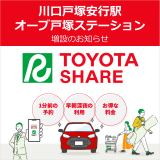トヨタシェア 川口戸塚安行駅オーブ戸塚ステーション 増設のお知らせいつもトヨタシェアをご利用いただきありがとうございます。このたび、川口市に新たなステーションがオープンいたしました!🎉 OPEN記念キャンペーン実施中!新ステーションのOPEN... 2025.10.11 キャンペーン
